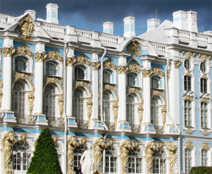 Екатерининский дворец в Царском Селе украшен колоннами, фигурами кариатид и атлантов, картушами и львиными масками